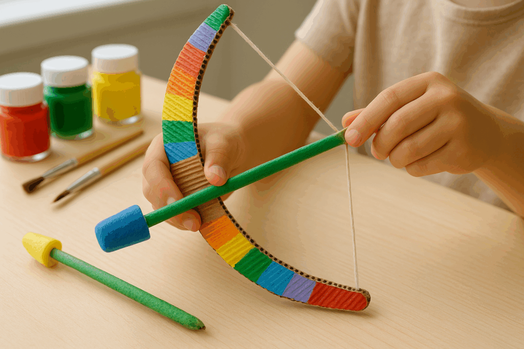 Kids’ bow-and-arrow craft: E-flute blanks with blunt tips. Paint and play. No splinters.