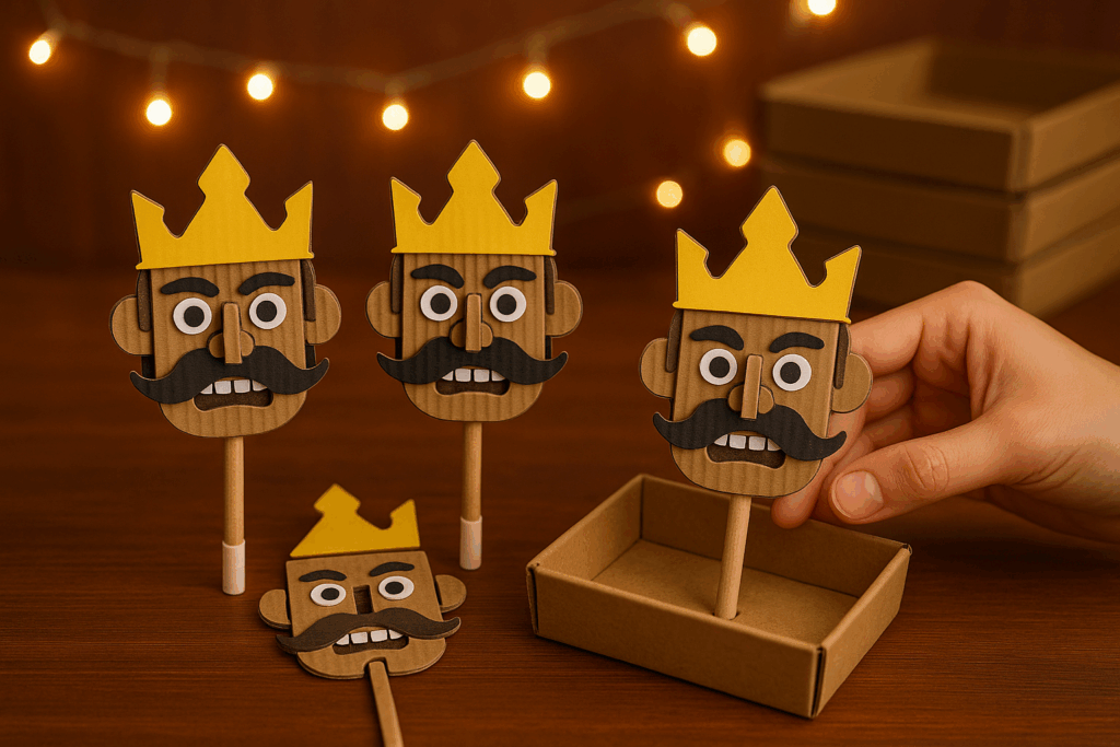 Mini Ravan puppets: Slot-lock faces and crowns. Do not burn. Reuse next year.