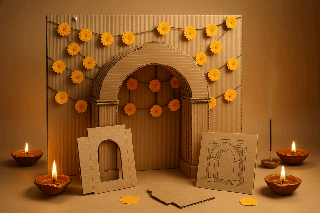 Entrance torans and backdrops: Layer corrugated panels. Cut, score, fold. Add paper florals. Skip thermocol.